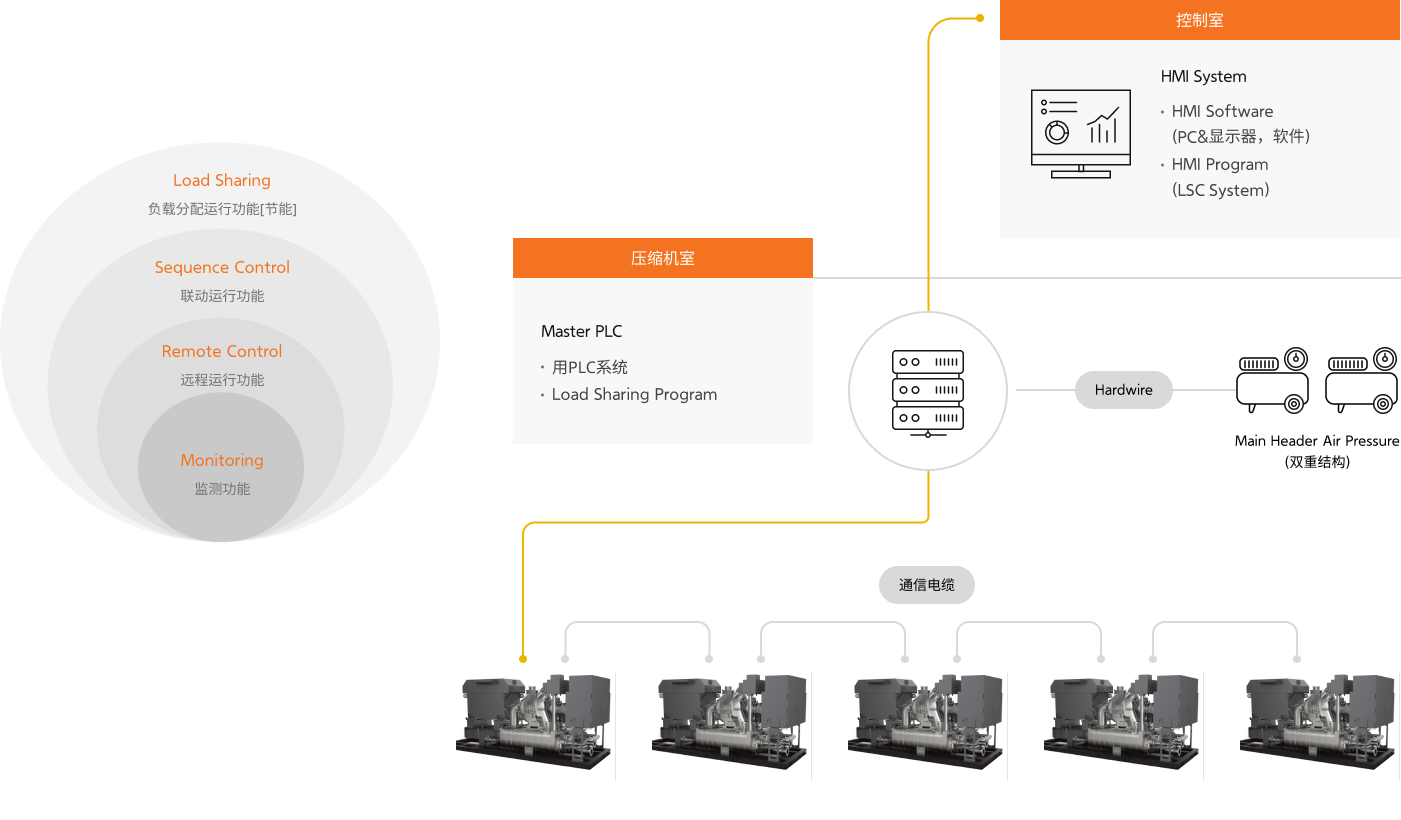 我们的负载联动系统是针对同时使用多台压缩机的现场,可以快速有效地应对现场压力和流量的变化,并为了产生最佳的压缩空气,控制压缩机的节能系统。