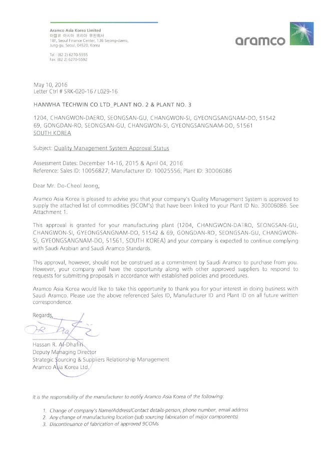 - 世界最大规模的石油资源公司。主要业务为开采、加工、炼油、勘探石油以及生产化工产品。 韩华已获得Aramco 公司正式入围供应商的资格。
