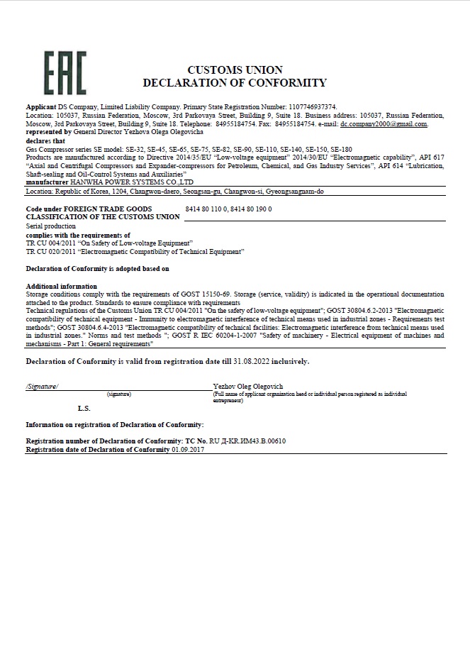 - Technical Regulation of Customer Union的缩写,通常称之为TR-CU或CU 认证。俄罗斯、白俄罗斯和哈萨克斯坦的GOST-R, GOST-B, GOST-K 结合而成。韩华压缩机在2013年2月15日获得了最新的相关认证。