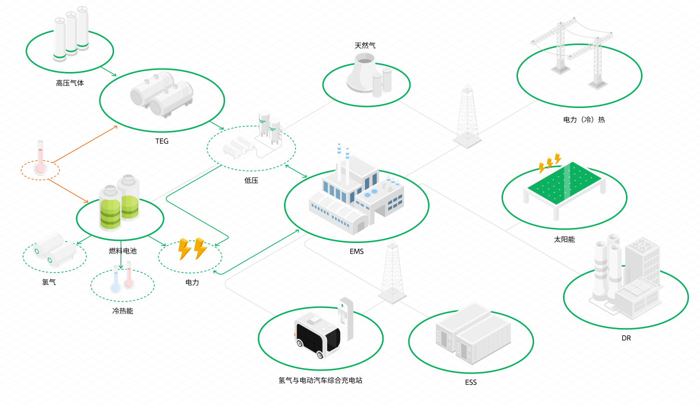 韩国天然气公司(KOGAS)以天然气门站为依托,构建区域枢纽型复合能源中心,供应电力、天然气、热能和氢气。该复合能源中心与小型分布式电网相连,公司还在其中安装了独特的涡轮膨胀发电机(TEG),目前已投入运营。